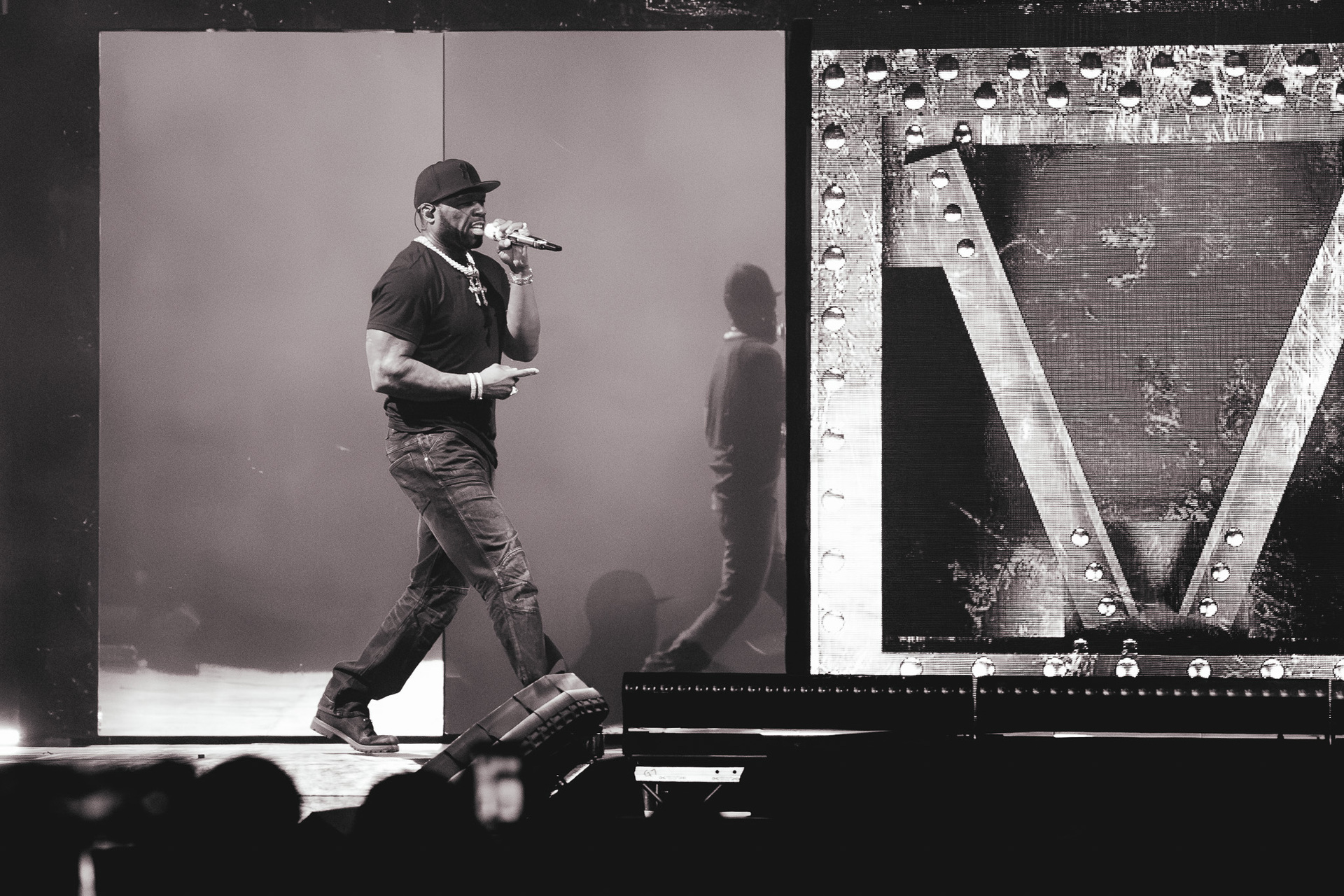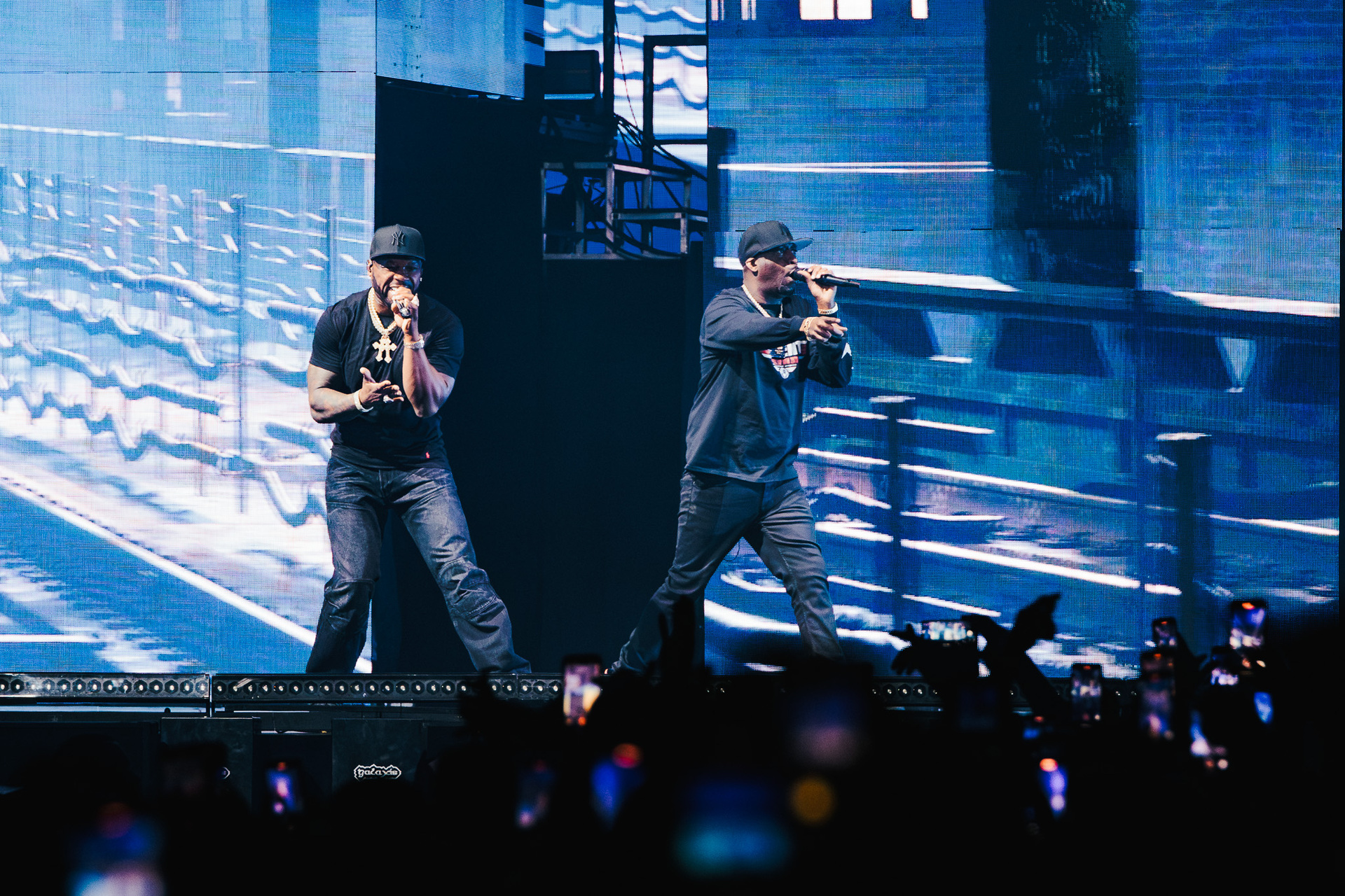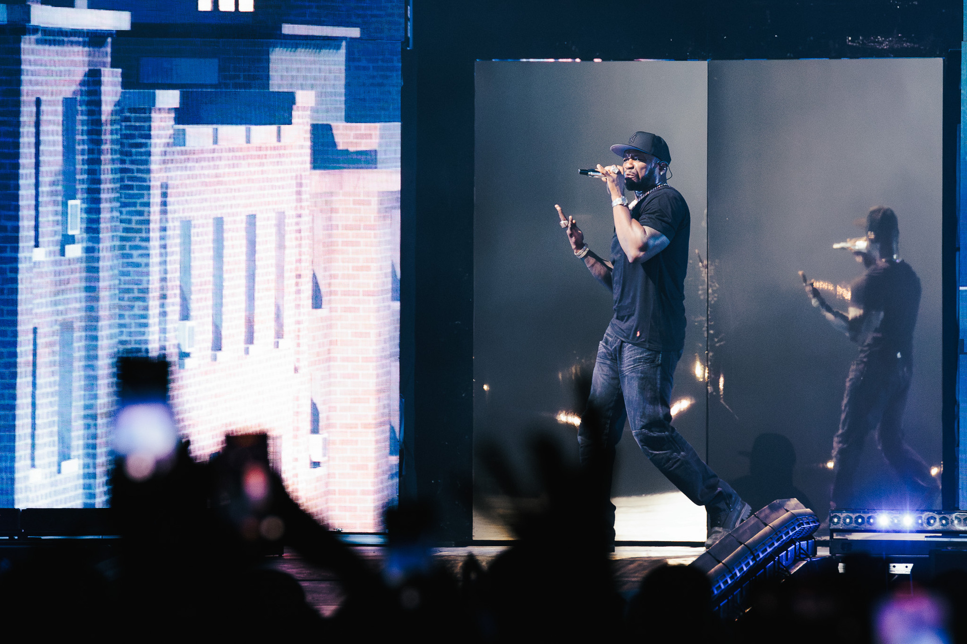 Još 45 minuta pauze i napokon je došlo vrijeme za zvijezdu večeri, a tijekom nastupa postalo je jasno čemu služi čitava svita kamiona koji su se poslagali po parkingu ispred Arene. Produkcija je bila na vrhunskoj razini, postav pozornice mijenjao se iz pjesme u pjesmu, outfiti gotovo istom brzinom, a prateće plesačice s uistinu zavidnim vještinama su izvirale iz svih kutova i dopunjavale spektakl. Na pozornici je bio i bend, koji je bio smješten na povišenim platformama dok je 50 Cent većinu nastupa nonšalantno šetao od jednog do drugog kraja stage-a.
